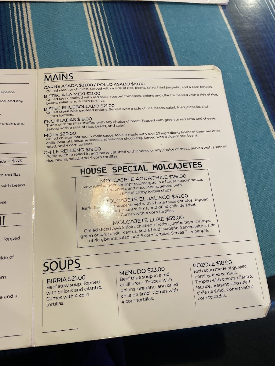 - Soups: Start your meal with the comforting Birria Soup, a rich beef stew, or the flavorful Pozole, teeming with guajillo and hominy. Each soup is generously accompanied by corn tortillas, ensuring satisfaction with every spoonful.